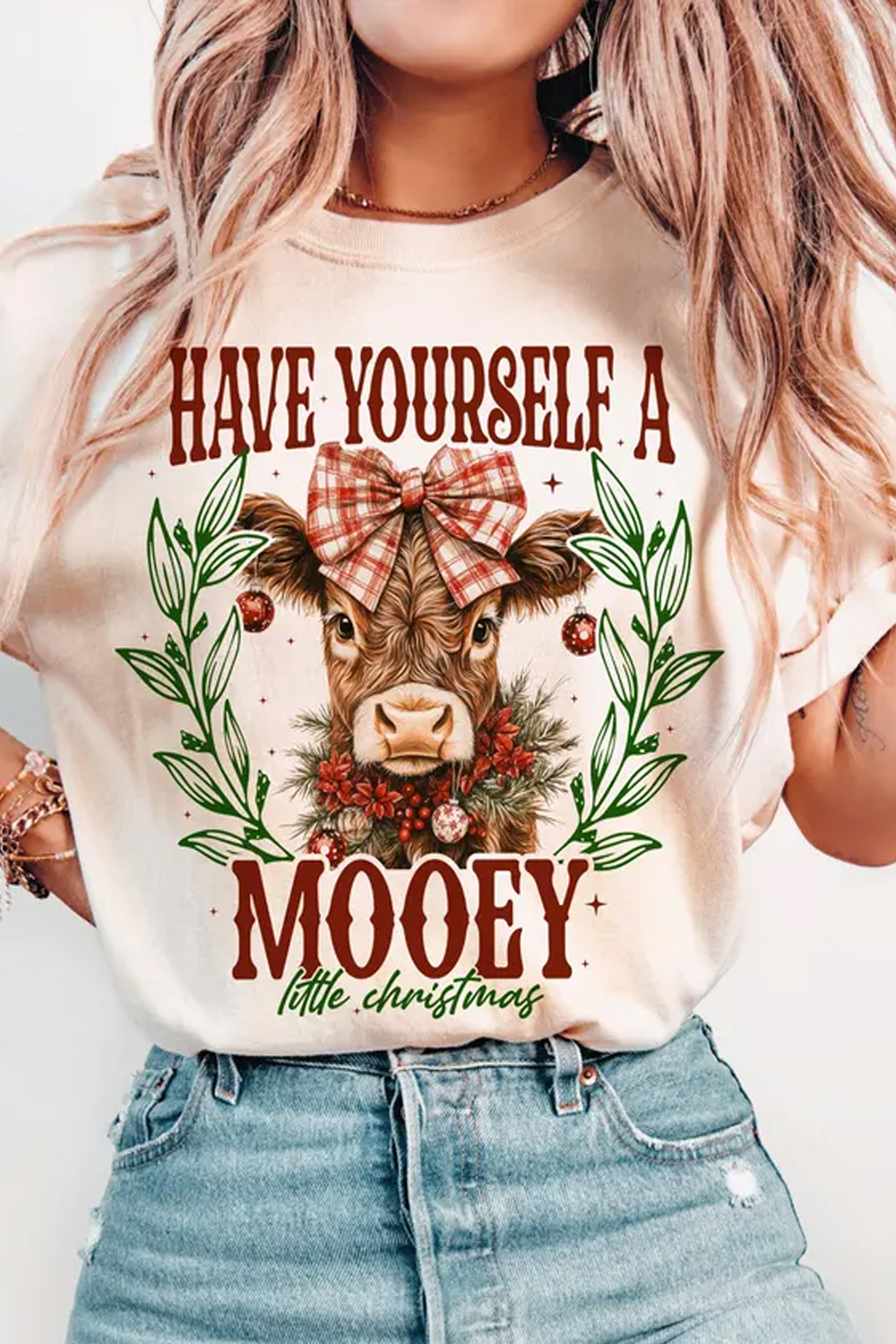 Christmas Bow Calf Printed Round Neck Ladies Short Sleeve T-Shirt