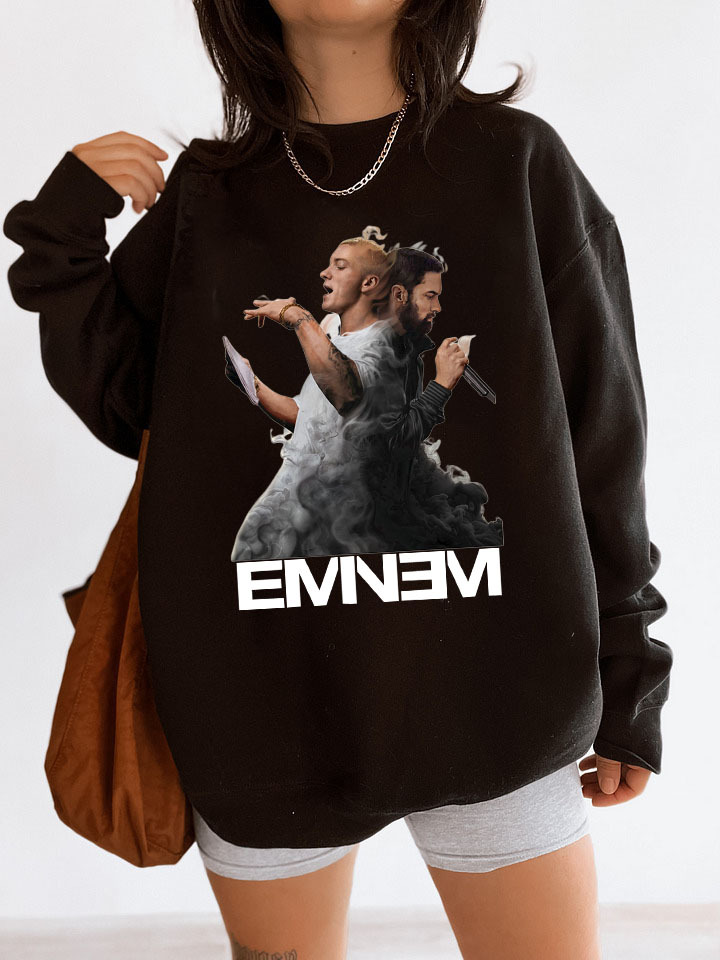 Eminem is a globally recognized rap superstar known for his unique lyric skills, speed, emotional depth and musical innovation. His album "The Marshall Mathers LP'' and hit single "Rap God" established his legendary status in the rap world. Wearing an Eminem-themed Sweatshirt is a way to pay tribute to this music legend and show recognition of his profound influence.